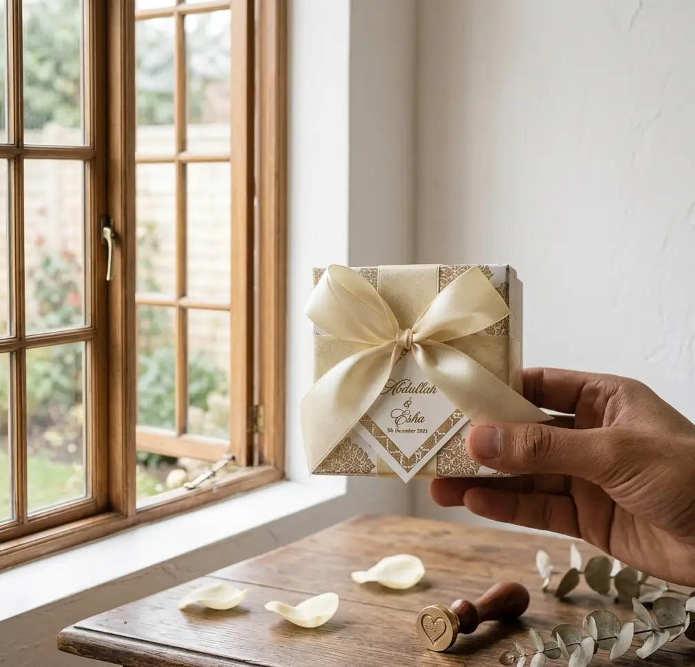 Square Bid Box with Ribbon bow and Name Tag printing and traditional pattern printing